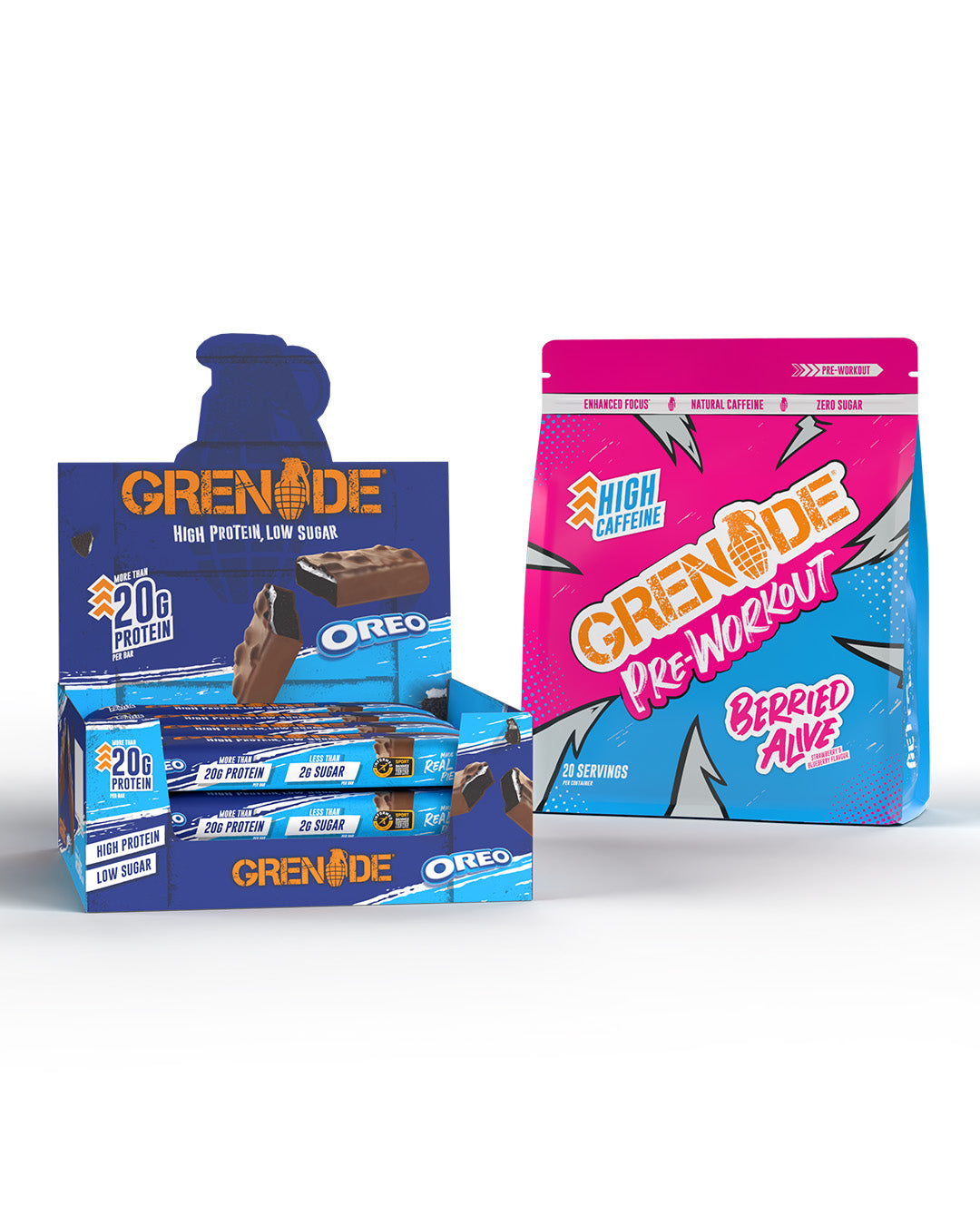 Pre-workout (20 servings - £26.25) -  ‘Get it Done’ whenever, wherever with Grenade Pre-Workout. Each serving is packed with high, natural caffeine, which is designed to be taken around 30 minutes before exercise to deliver the ultimate energy kick to increase your performance and focus.