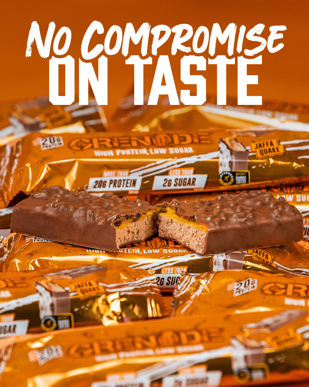 Crammed with 22g protein and just 2g sugar, the Grenade Jaffa Quake Protein bar is the ultimate snack-time saviour to bring some ZEST to your life!